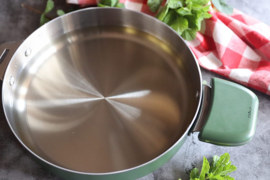 • In den Topf gebe ich Essig und Wasser und bringe alles zum Kochen.
