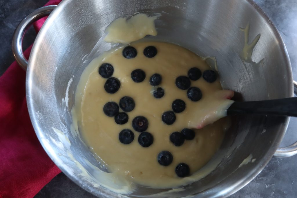 Ich rühre mit dem Spatel und füge die Blaubeeren vorsichtig hinzu.