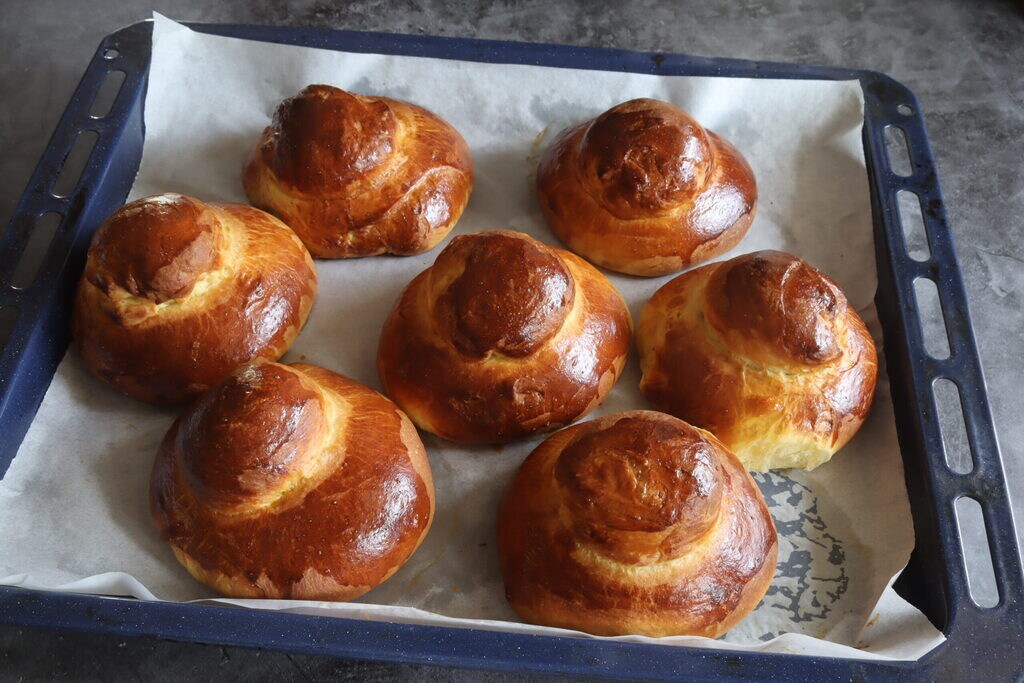 Bestreichen Sie die Brioches mit der zuvor aufgehobenen Milch und den Eiern.