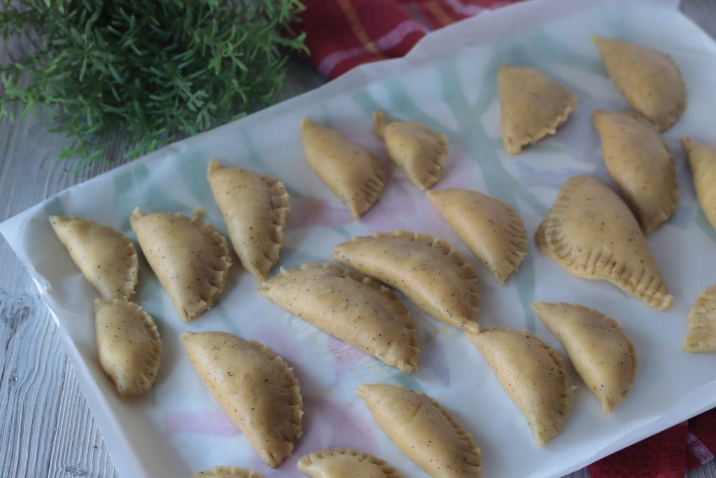 Nach der Ruhezeit den Teig mit der Teigrolle dünn ausrollen, mit einem Glas oder einer speziellen Ausstechform für halbmondförmige Ravioli Teigscheiben ausstechen. Verteilen Sie einen Teelöffel Füllung auf der Hälfte der Scheiben und schließen Sie sie mit der anderen Hälfte, indem Sie die Ränder gut versiegeln. Ich habe 11 nur mit Ricotta und 11 mit Ricotta und Kaffeepulver vorbereitet.