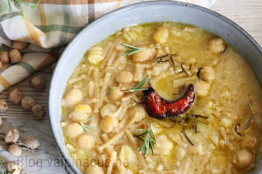 Am Abend vor der Zubereitung von Pasta und Kichererbsen weiche ich die Kichererbsen in reichlich kaltem Wasser ein. Am nächsten Morgen wasche ich sie und gebe sie in den Schnellkochtopf mit einer Knoblauchzehe und einem Rosmarinzweig, koche sie bei mittlerer Hitze 25 Minuten ab dem Siedepunkt. Nach dieser Zeit, nachdem ich die Garzeit überprüft habe, nehme ich ein Glas Kichererbsen aus dem Kochwasser und püriere sie im Zerkleinerer zu einer Creme. Ich gebe die Kichererbsen mit dem Kochwasser in einen Topf, füge Salz hinzu und sobald es wieder kocht, die gemischte Pasta. Ich habe Reste von geöffneten Nudelpäckchen verwendet und auch lange Nudeln gebrochen. In der Zwischenzeit habe ich das Öl mit dem Knoblauch und dem Rosmarin in einen kleinen Topf gegeben, sie angebraten und dann zusammen mit der zuvor zubereiteten Kichererbsencreme zu den Pasta und Kichererbsen gegeben.
