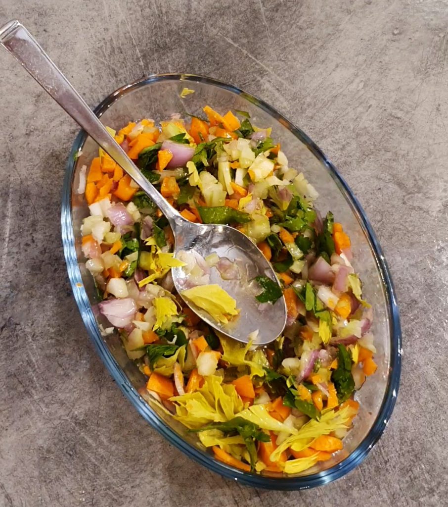 In der Zwischenzeit bereite ich das Dressing aus Karotten, Sellerie, Petersilie, Zwiebel und einer entkernten Knoblauchzehe vor. Ich schneide alles in kleine Stücke, die ich dann mit nativem Olivenöl, Salz, Zitronensaft und frisch gemahlenem Pfeffer würze.