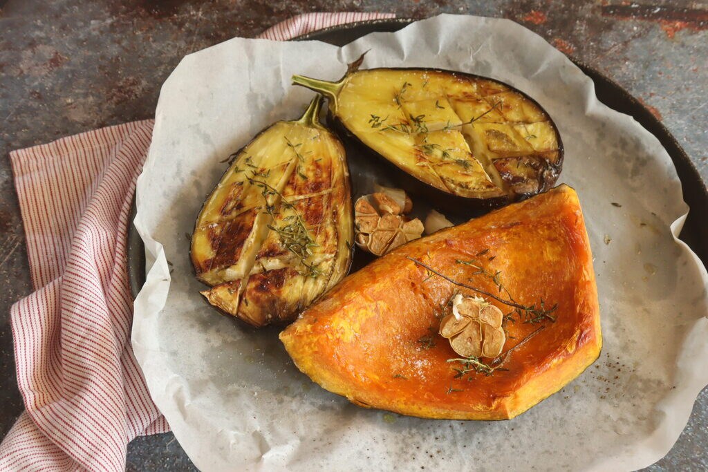Schneiden Sie die Aubergine in der Mitte durch und machen Sie auf beiden Seiten diagonale Schnitte, würzen Sie sie zusammen mit dem Kürbis mit Knoblauch und Rosmarin, mit Thymian und ein paar Lorbeerblättern, natürlich das Salz mit Olivenöl und Thymianblättchen. Stellen Sie das Backblech bei 180° für 30 Minuten in den Ofen.