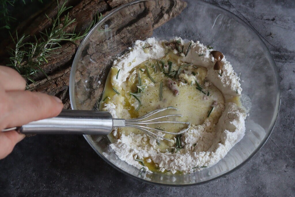 • In der Glasschüssel mische ich alle Zutaten zusammen. Mehl und Salz, Wasser und Olivenöl, gehackter frischer Rosmarin (alternativ geht auch getrockneter Rosmarin).
