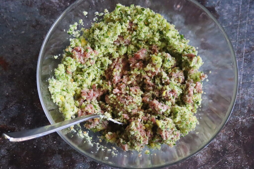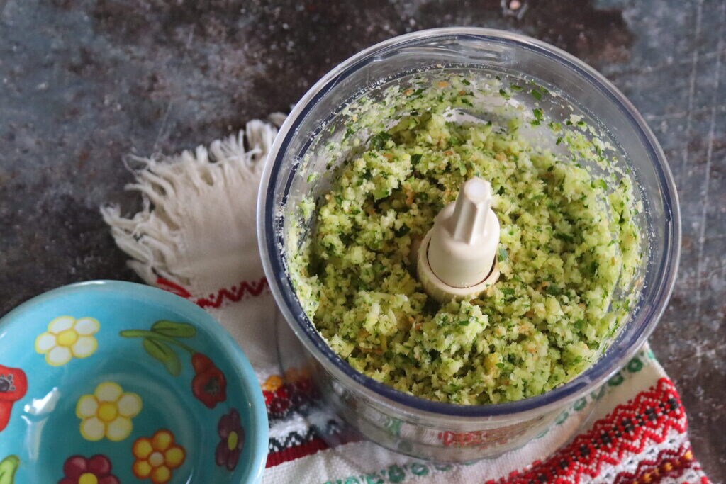 • In den Zerkleinerer habe ich die Zucchini zusammen mit der Petersilie und dem Knoblauch gegeben, die Schale einer halben Zitrone mit ein wenig Paniermehl, ich habe alles zerkleinert, bis es homogen war, den Rest des Paniermehls hinzugefügt, eine Prise Salz und gemischt.