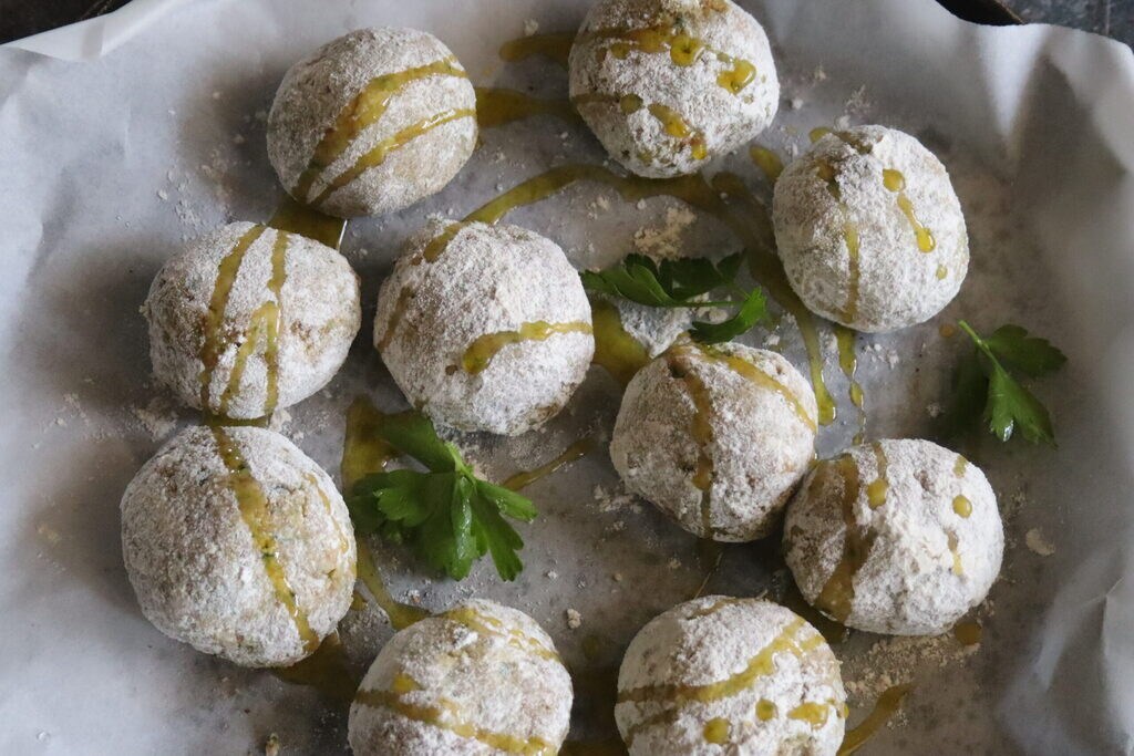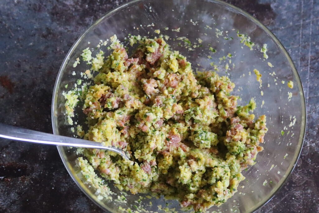 • und die Mischung gut vermengt; sollte sie zu weich sein, fügt noch etwas Paniermehl hinzu.