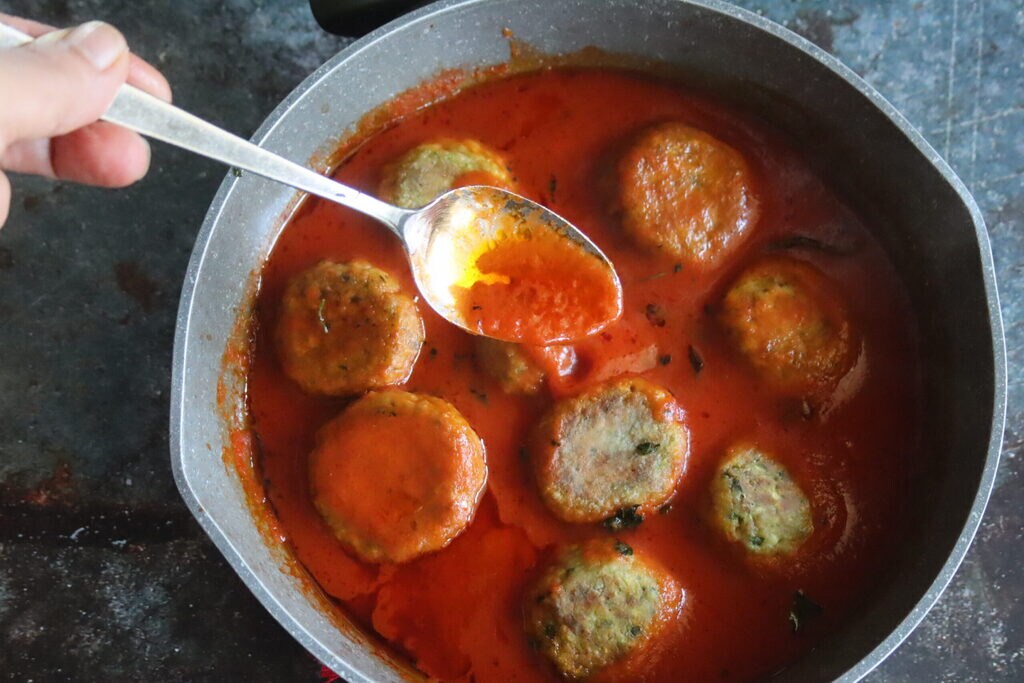 • sobald die Fleischbällchen fertig waren, habe ich sie in die Tomatensauce getaucht