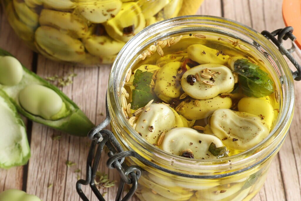 Nachdem ich die Saubohnen mit den Gewürzen in Gläser gefüllt hatte, habe ich die beiden Ölsorten hinzugefügt, natürlich habe ich die Gläser sterilisiert, indem ich sie 30 Minuten in Wasser kochte und dann in demselben abkühlen ließ.
