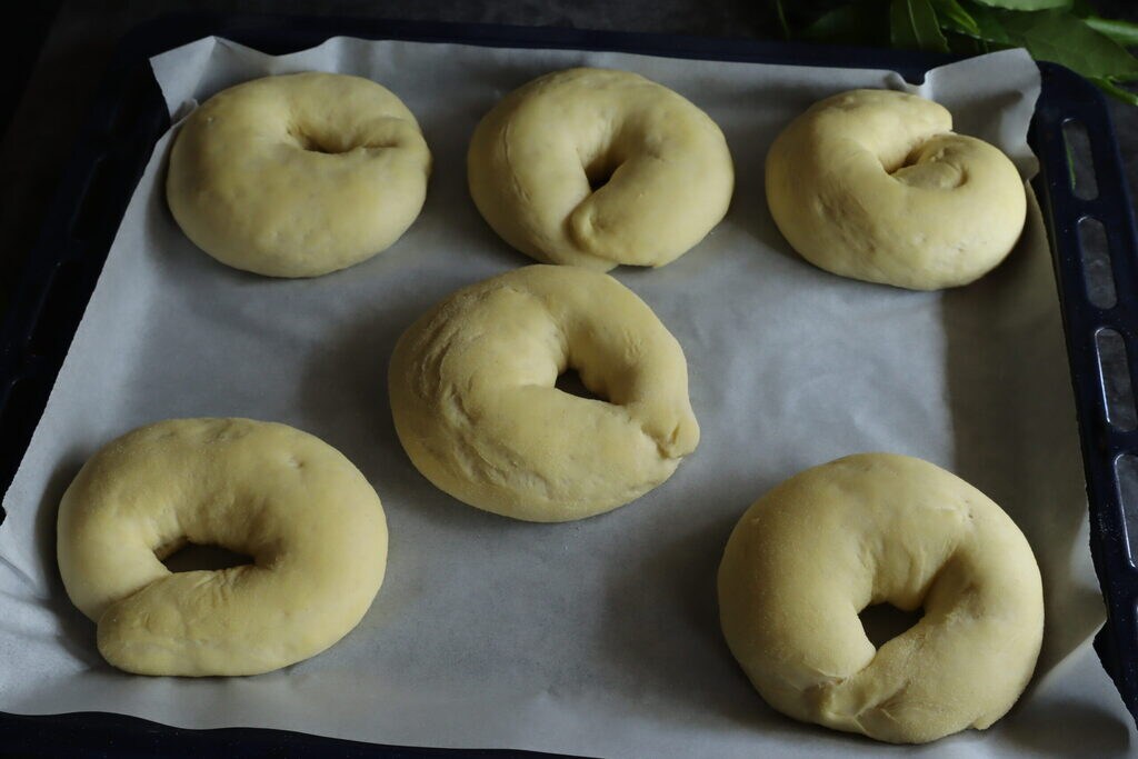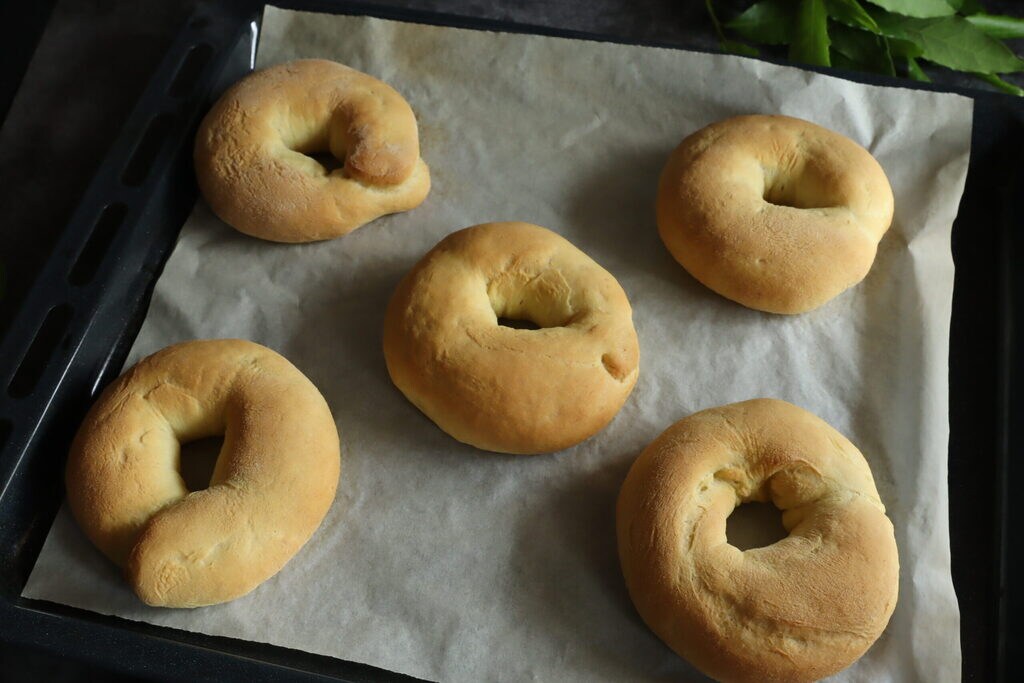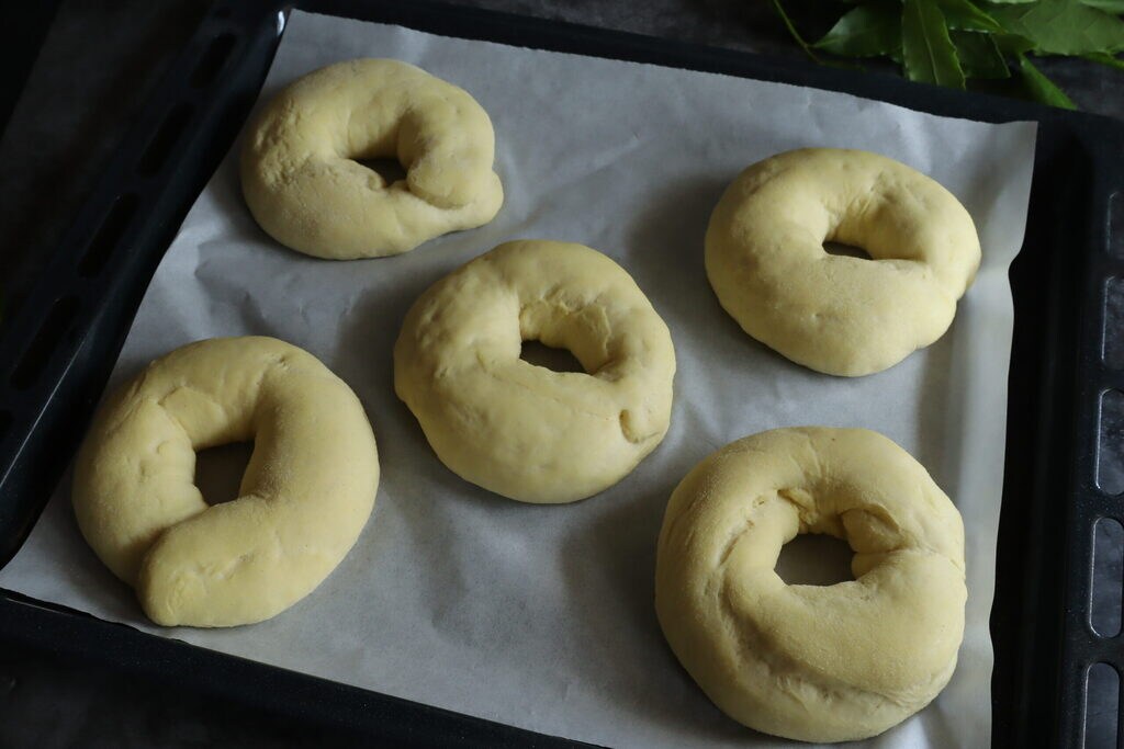Formen Sie jedes einzelne Stück zu einem Strang und schließen Sie es zu einem Kranz, legen Sie die Friselle auf das mit Backpapier ausgelegte Blech, mit Abstand dazwischen, da sie im Volumen zunehmen.