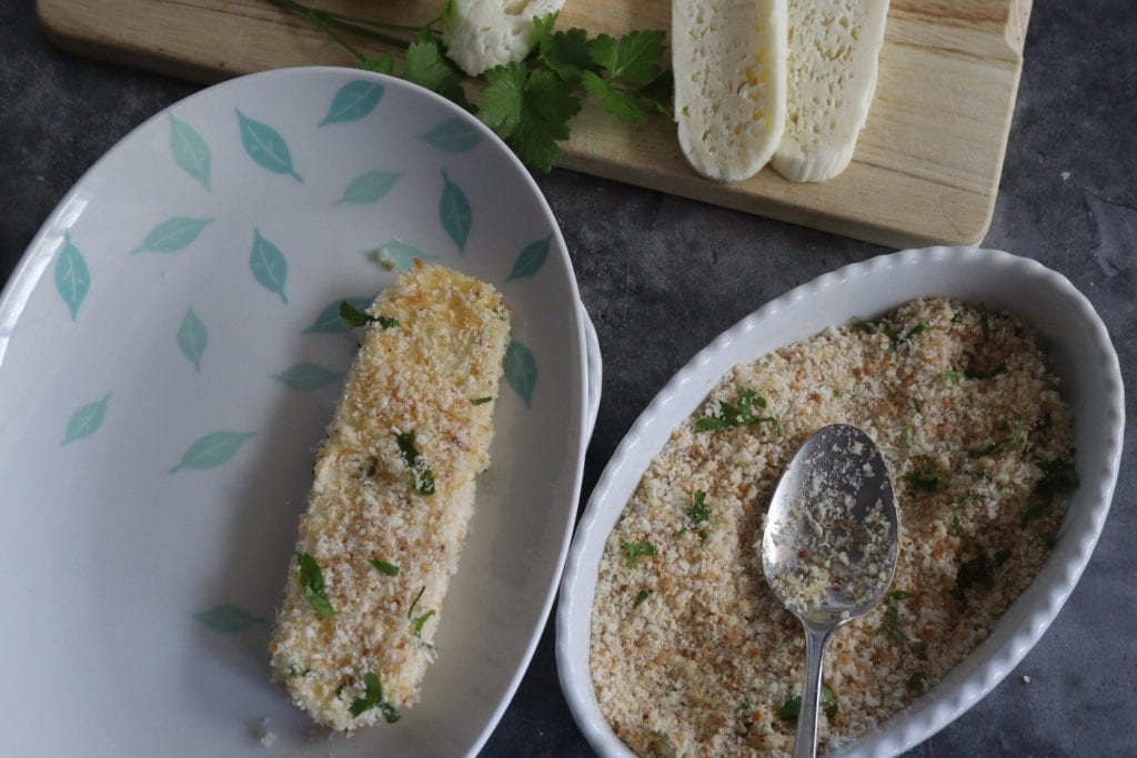 und dann durch die gewürzten Semmelbrösel.