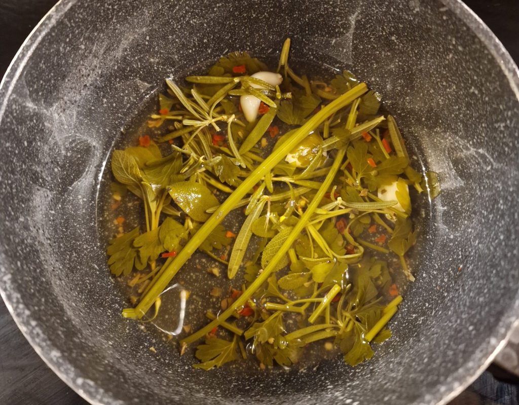 • Währenddessen habe ich Essig und Weißwein mit allen Kräutern (aus meinem kleinen Kräutergarten) für zehn Minuten erhitzt.
