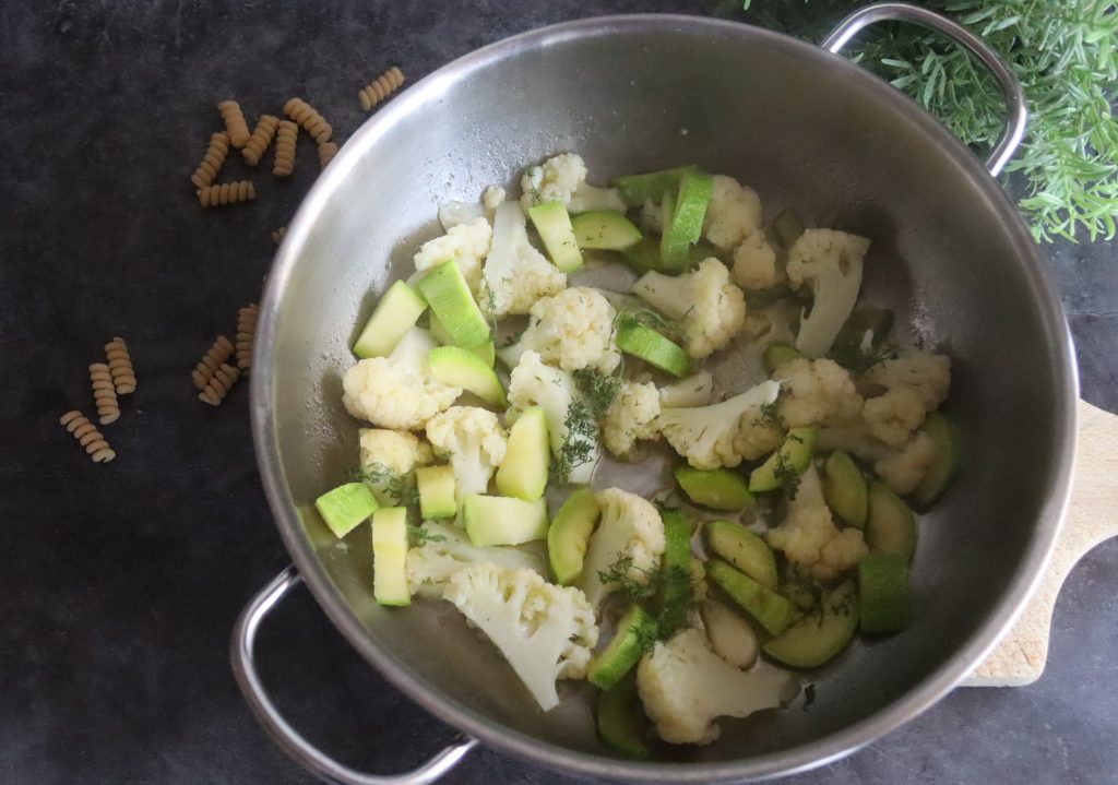 Ich schneide die Blumenkohlröschen in kleine Teile, wasche und trockne sie und lasse sie im Topf zusammen mit dem Öl und dem Knoblauch 5 Minuten mit geschlossenem Deckel dünsten. Ich füge eine Zucchini hinzu, die in kleine Stücke geschnitten ist, ohne sie zu schälen.