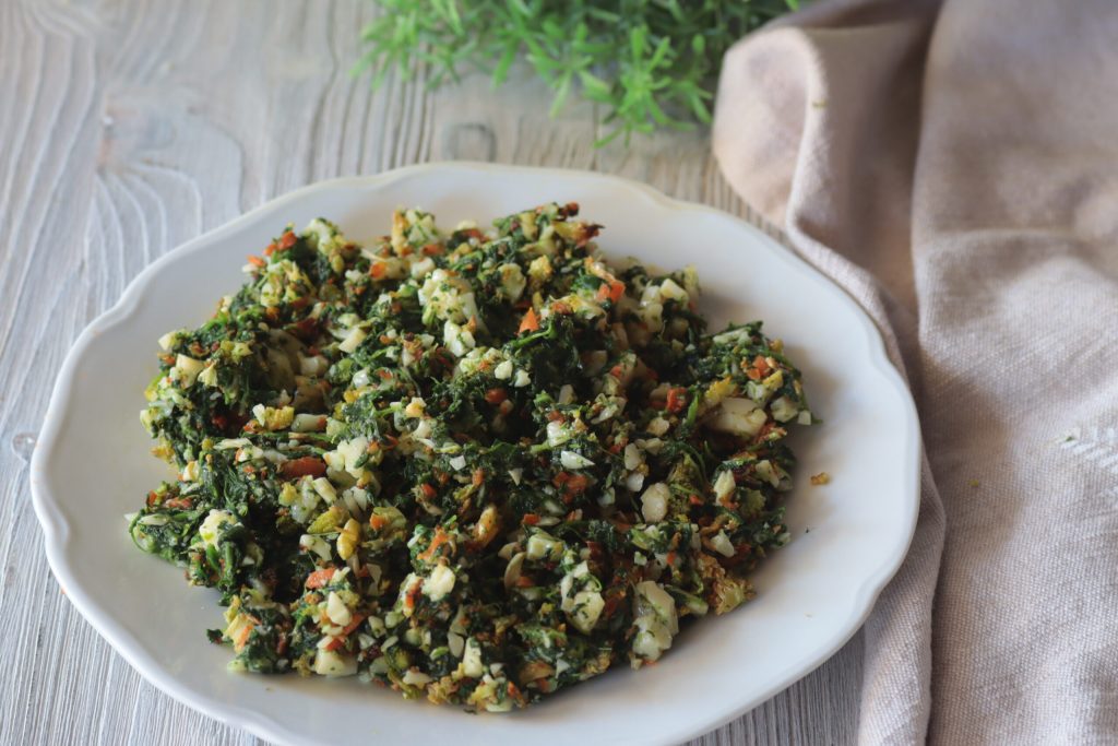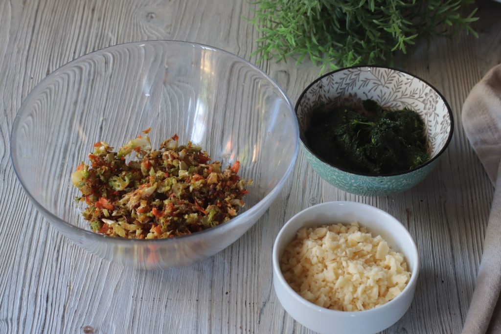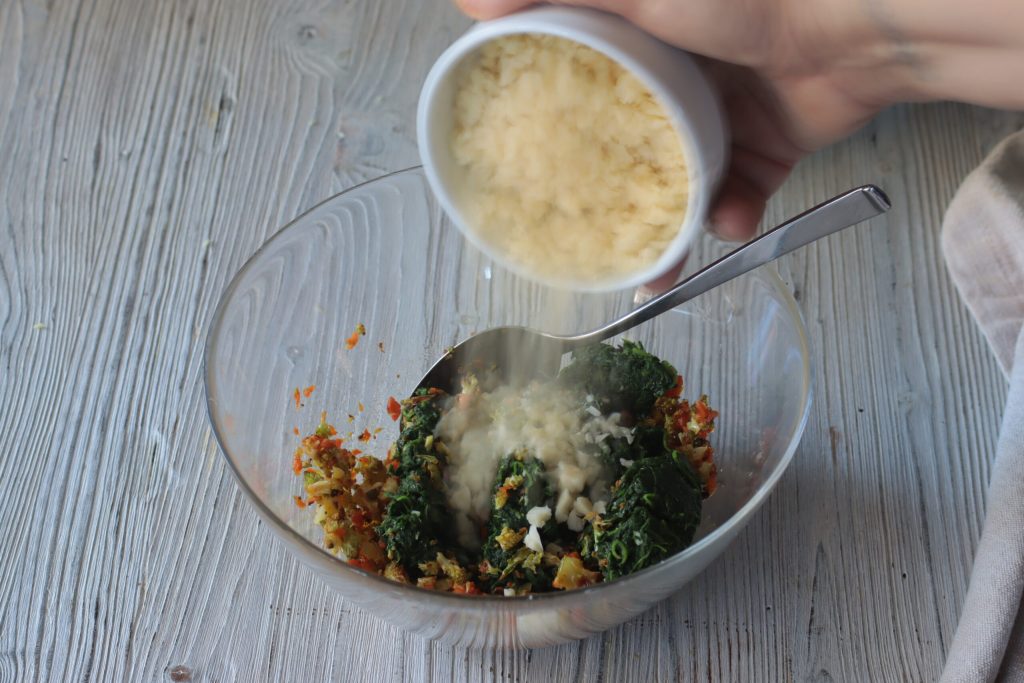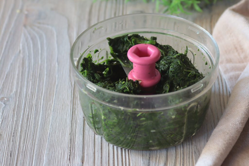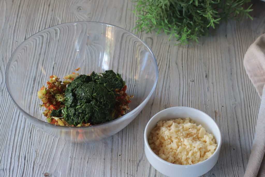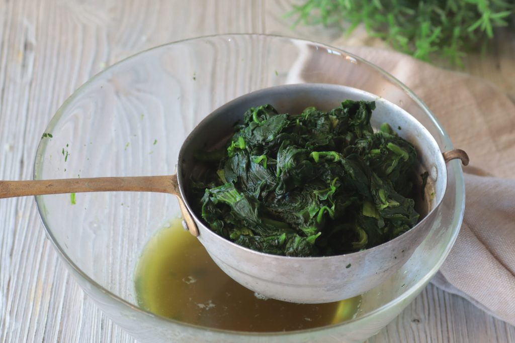 Man kann bereits gekochten und abgetropften Spinat oder anderes gekochtes Gemüse verwenden oder den Spinat kochen und abtropfen lassen.