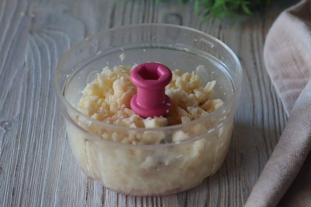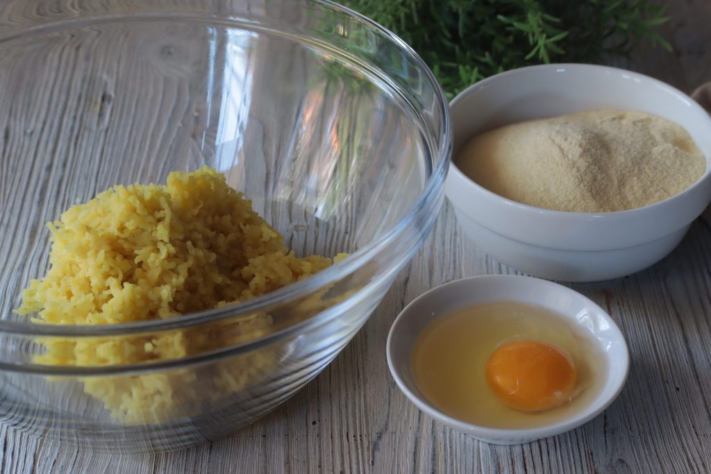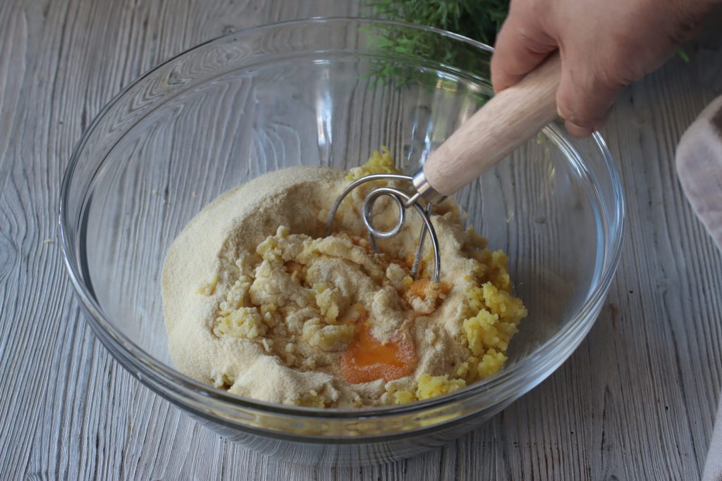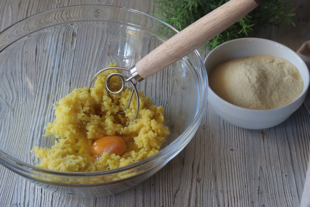 ebenso habe ich den zerkleinerten Emmentaler der Füllung für die Kartoffeltaschen hinzugefügt.