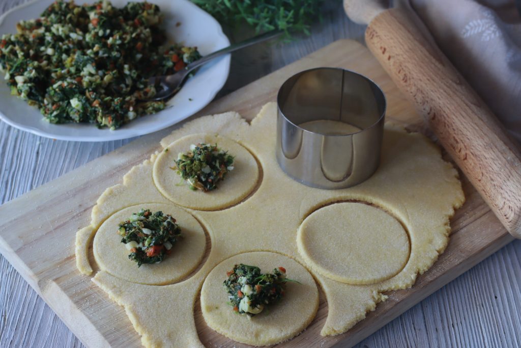 Ich gebe einen Teelöffel Füllung in die Mitte jedes Kreises