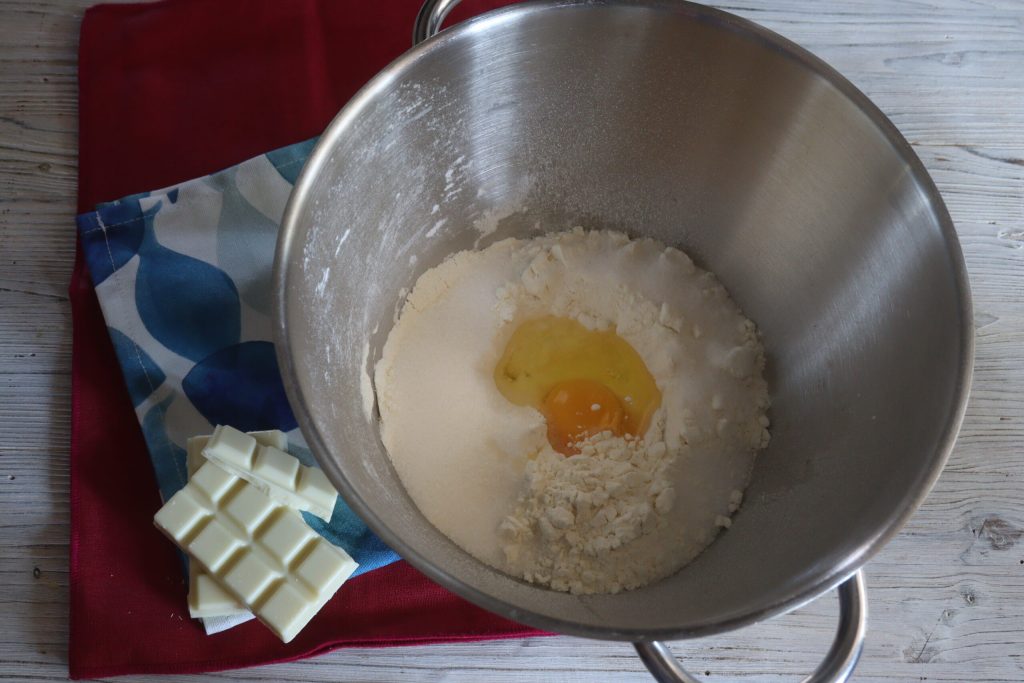 Ich habe das Mehl mit dem Zucker und der Butter mit den Eiern in die Küchenmaschine gegeben.