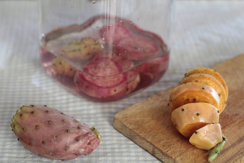 Likör aus Kaktusfeigen, als Sizilianerin durfte auf meinem Blog ein Elixier von solcher Bedeutung natürlich nicht fehlen. Diese wunderbaren Früchte reifen in der Sonne und benötigen keine besondere Pflege und auch kein Wasser! Die Kaktusfeige ist eine sehr süße, aber ziemlich dornige Frucht, daher ist beim Schälen große Vorsicht geboten, bürsten Sie die Früchte gut. Wir wissen, dass sie neben dem köstlichen Verzehr frisch gepflückt auch in der Küche zur Zubereitung von Marmeladen, Desserts, Eiscreme und natürlich auch in köstlichen Likören verwendet wird. Die Kaktusfeige hat aufgrund ihres hohen Ballaststoffgehalts schlankmachende Eigenschaften, wirkt energetisierend und erfrischend. Entgegen ihres Namens scheint sie mexikanischen Ursprungs zu sein, dennoch wird der ganze Süden Italiens angenehm von dieser wunderbaren Pflanze überflutet.