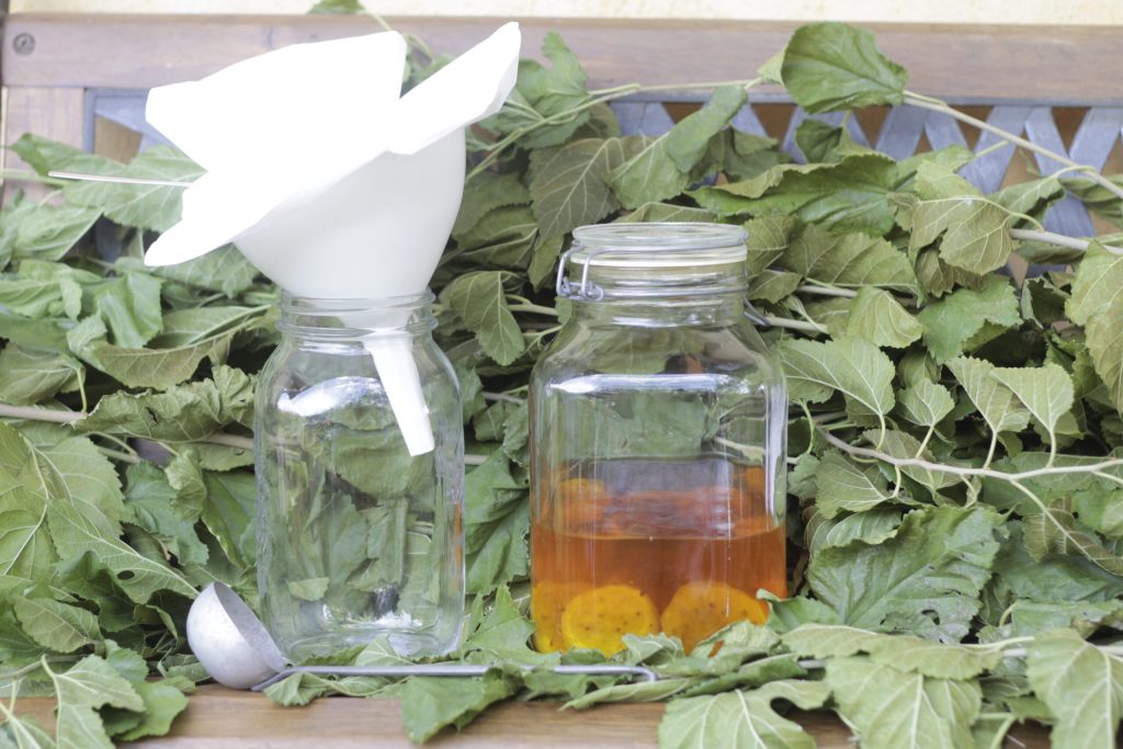 Nach der Ruhezeit von 2 Wochen filtern Sie mit Hilfe von Gaze und Trichter. Schütten Sie in ein Gefäß mit hermetischem Verschluss