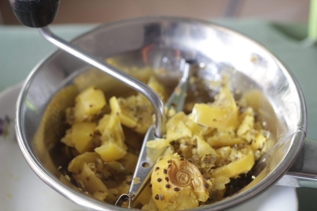 Geben Sie in die Passiermühle (wenn Sie keine Presse zu Hause haben), was von den Kaktusfeigen übrig bleibt, und versuchen Sie, den gesamten Saft zu extrahieren. Lösen Sie den Zucker im kochenden Wasser auf, um den Sirup zuzubereiten.