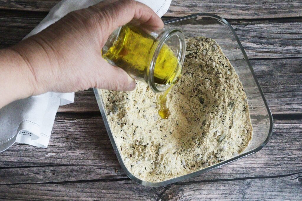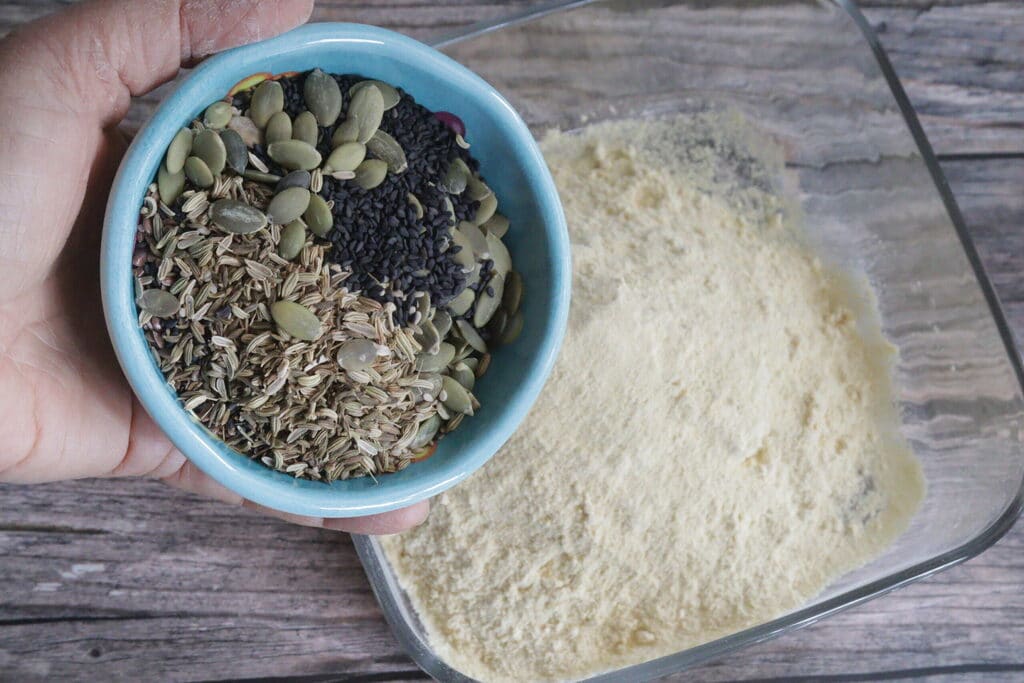 Natürlich habe ich die Samen gewählt, die ich am häufigsten in meiner Küche verwende und die mir gefallen. Es ist jedoch klar, dass ihr andere wählen könnt. Wichtig ist das Endgewicht, insgesamt 100 Gramm. Mischt die gemischten Samen mit dem Kichererbsenmehl.