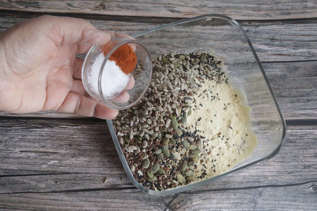 Fügt die Paprika und das Salz zur Samen- und Kichererbsenmehlmischung hinzu.