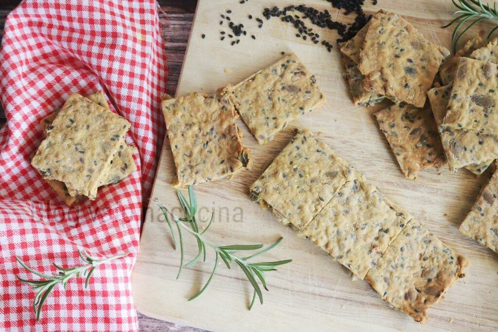 Kichererbsenmehl- und Samencracker, viele duftende Samen wie Fenchelsamen, die ich unbedingt hinzufügen musste. Meine Erinnerung an die Berge, sprechen wir von den Dolomiten, ist genau dort, wo ich immer ein sehr niedriges Kräuterbrot mit vielen duftenden Fenchelsamen gegessen habe, und vergebt mir, wenn ich mich nicht mehr an den genauen Namen erinnere. Ich dachte an die Kichererbsenmehlcracker und an meine Freundin, die Gluten nicht mag, oder besser gesagt, Gluten mag sie überhaupt nicht, und deshalb habe ich an sie gedacht und anstelle von Brot diese köstlichen und fantastischen Samencracker gemacht.