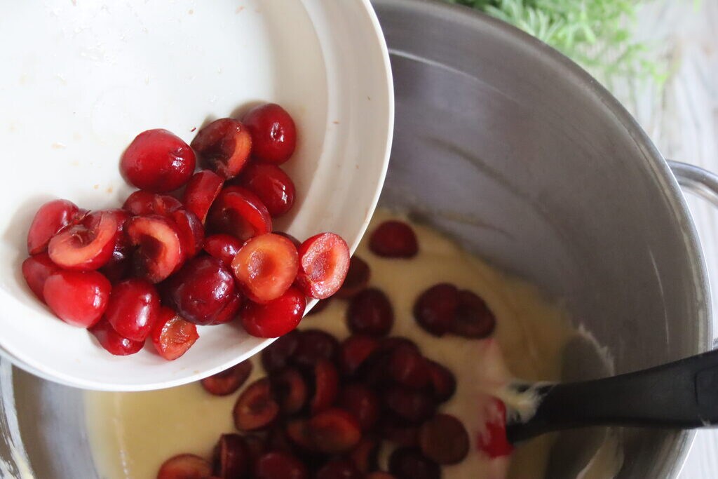 • In der Zwischenzeit die Kirschen halbieren und entsteinen.