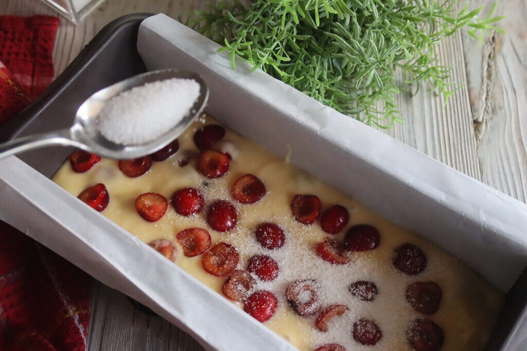 • Und hier ist er, bereit der Kuchen mit Kirschen, hervorragend für den Muttertag oder zum Frühstück.