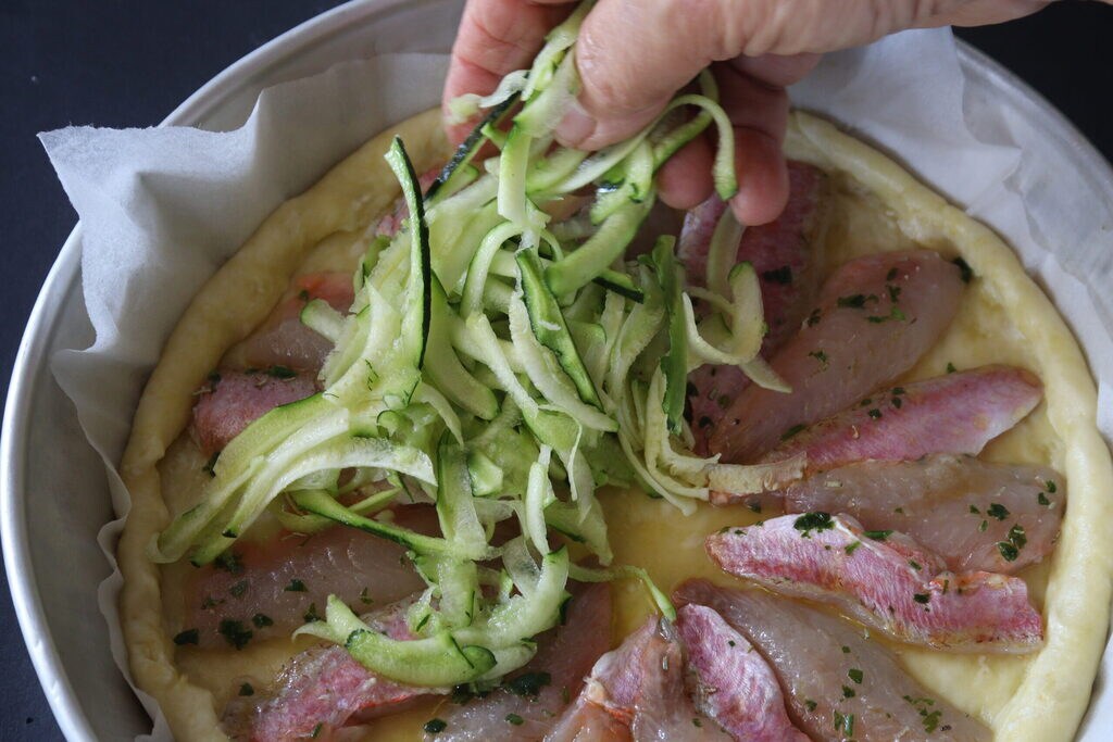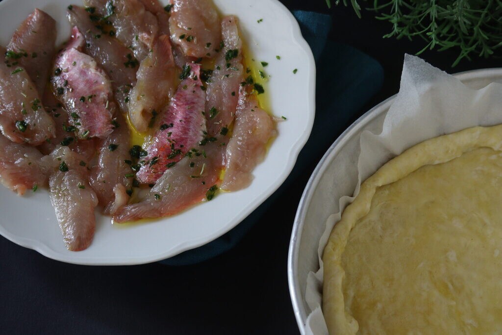Küchlein mit Rotbarbenfilets, eine einfache Möglichkeit, ein einzigartiges Gericht mit Fisch, Zucchinibeilage und Blätterteigboden auf den Tisch zu bringen. Ideal als einzigartiges Gericht, eine Alternative zu den üblichen Fischen wie Kabeljau, Seezunge oder Dorade, die sehr lecker sind, aber die Rotbarbe ist ein blauer Fisch mit leicht verdaulichem und magerem Fleisch, reich an Vitaminen und natürlich Omega 3. Einziger Nachteil ist, dass die Rotbarbe leider sehr viele Gräten hat und man deshalb besonders vorsichtig sein muss, vor allem wenn Kinder das Küchlein mit Rotbarbenfilets verzehren.