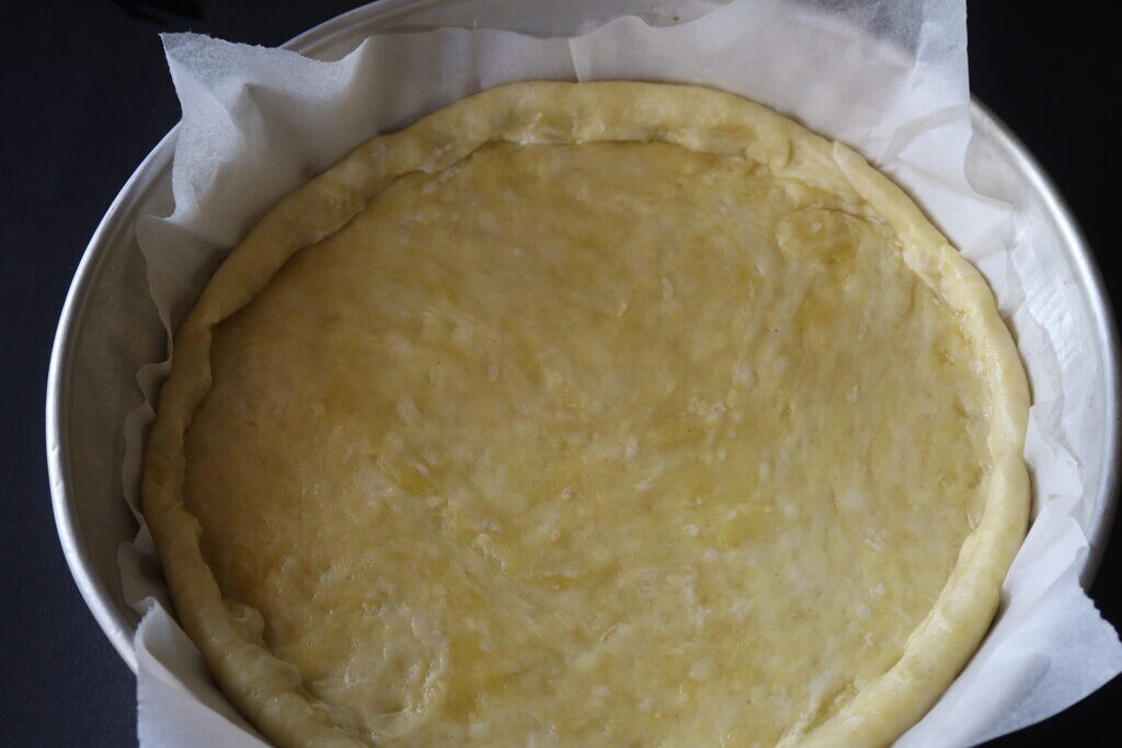 Der Blätterteig ist bereit, rollen Sie ihn mit dem Nudelholz aus und legen Sie ihn in die Form mit Backpapier.