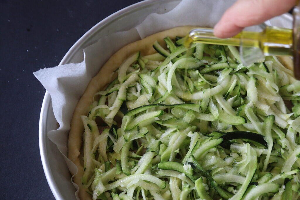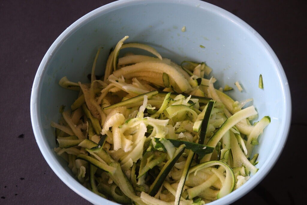 Ohne die Zucchini zu schälen, waschen und putzen Sie sie, schneiden Sie sie mit dem geeigneten Werkzeug in Julienne.