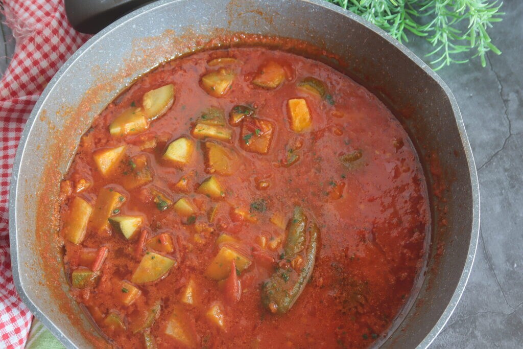 Während der Kürbis mit den Zucchini und dem Rest kochten, fügte ich die zuvor pürierten kleinen Tomaten hinzu. Lassen Sie es 35 Minuten kochen