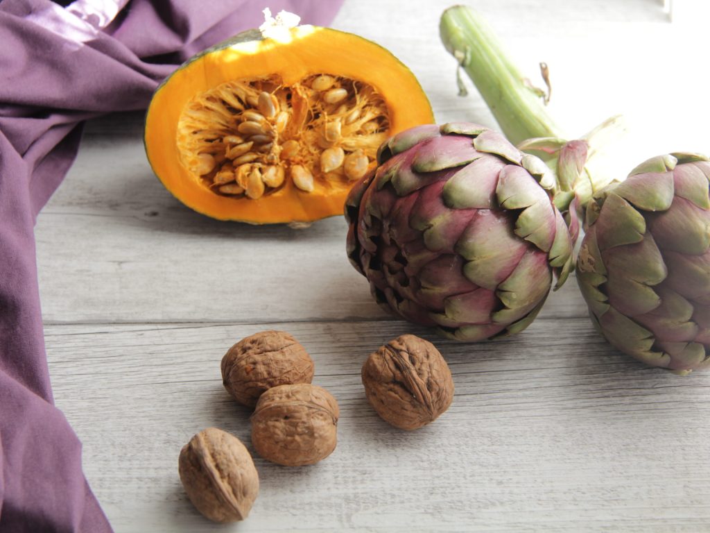 • Würzen Sie den Kürbis mit Salz und Öl und backen Sie ihn für 15 Minuten bei 190°C im Ofen. Machen Sie dasselbe mit den Artischocken und den Stielen.