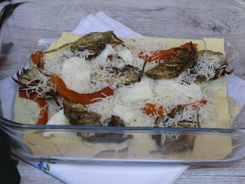 • Schneiden Sie den Mozzarella in Stücke und beginnen Sie, die Lasagne zu schichten. Beginnen Sie mit zwei Esslöffeln Bechamel am Boden der Auflaufform, dann die Teigblätter, eine Prise Parmesan, eine Handvoll Artischocken, einige Stückchen Kürbis und den Mozzarella. Machen Sie vier Schichten, daher teilen Sie die Artischocken, den Kürbis und den Mozzarella bereits in vier Teile auf, es ist bequemer und alle Schichten werden gleich.