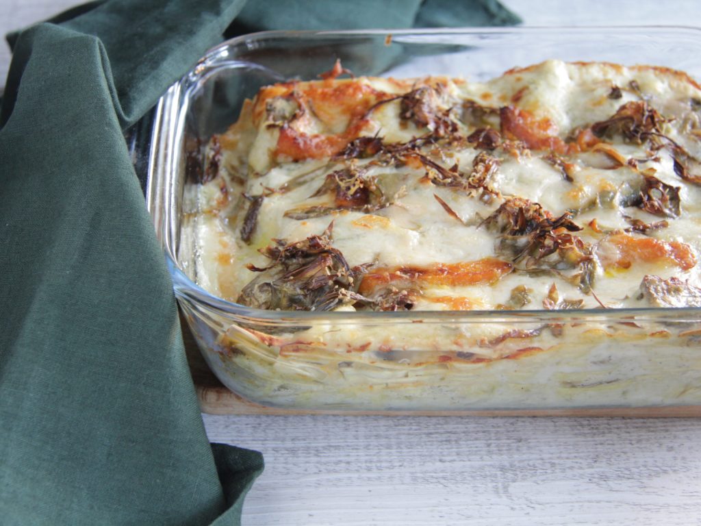 Lasagne mit Artischocken und Kürbis, eine gute Alternative zur klassischeren Lasagne mit Fleischragout, besonders wenn man Vegetarier ist. Dies ist die Geschichte einer schnellen Lasagne, und abgesehen von der Bechamel würde ich sogar sagen, dass sie leicht ist. Meine Lasagne erfordert keine Vorkochung der trockenen Teigblätter, dank meines Ofens, der es mir ermöglicht, gleichzeitig mit Dampf und Umluft zu backen, eine tolle Kombination, um die Lasagne in kürzester Zeit zuzubereiten. Mein Gemüse, die Artischocken und der Kürbis, backe ich im Ofen mit sehr wenig Öl, so bleiben sie schön knusprig, und die Artischockenstiele, ebenfalls im Ofen gebacken, hacke ich im Mixer und füge sie der Bechamel hinzu. Ich garantiere euch, dass eine Artischockenbechamel so euer Gericht sicher bereichern wird.