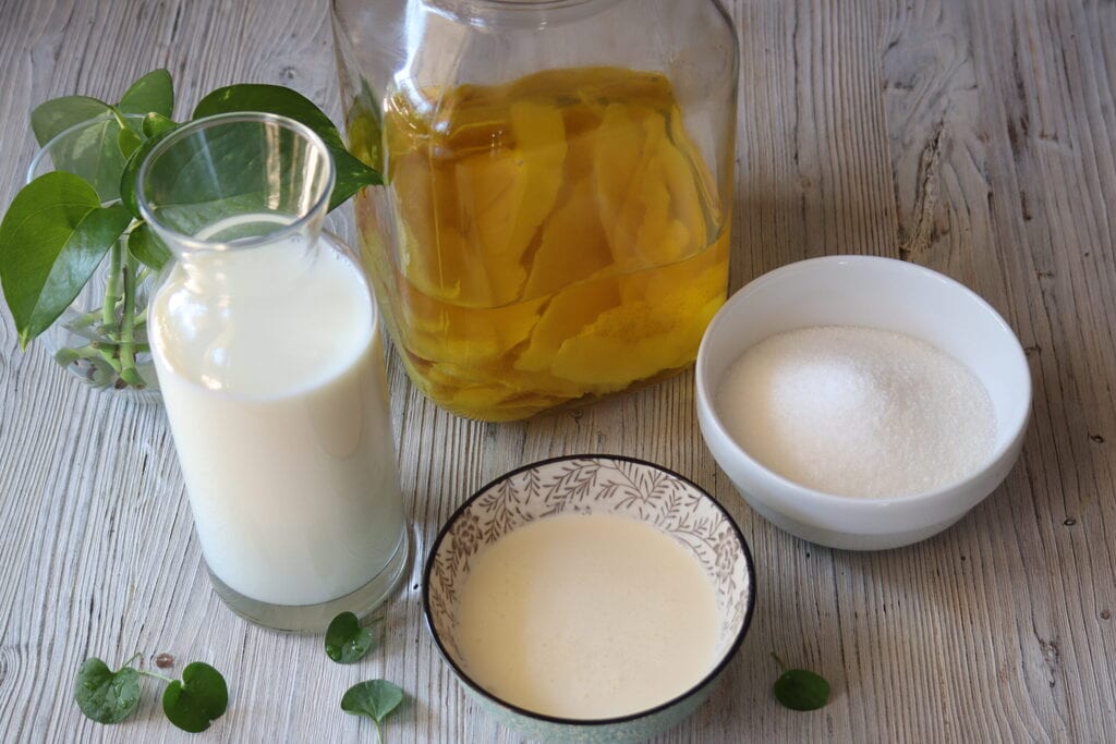 Nach der Zeit filtere ich die Flüssigkeit mit dem Sieb. Die Zitronenschalen werfe ich nicht weg, sondern gebe sie in den Topf mit der flüssigen frischen Sahne, dem Zucker und der frischen Milch. Lasse es bei niedriger Hitze 10 Minuten kochen.