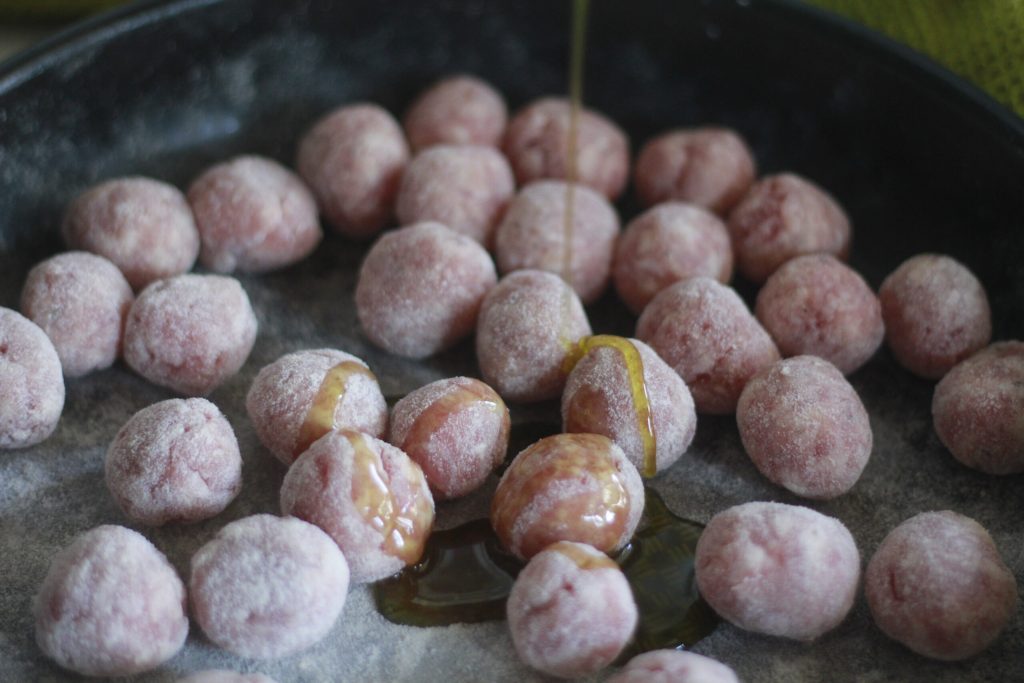 Für das Braten der Bällchen genügt sehr wenig Öl in der Pfanne.