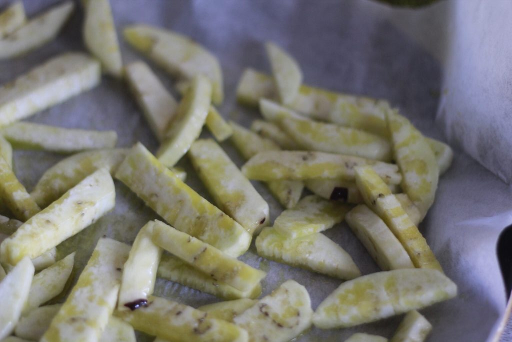 Inzwischen habe ich im Mikrowellenherd die Auberginen in Stäbchen geschnitten und im Crisp-Modus für 15 Minuten gegart, nachdem sie mit Salz und Olivenöl gewürzt wurden.