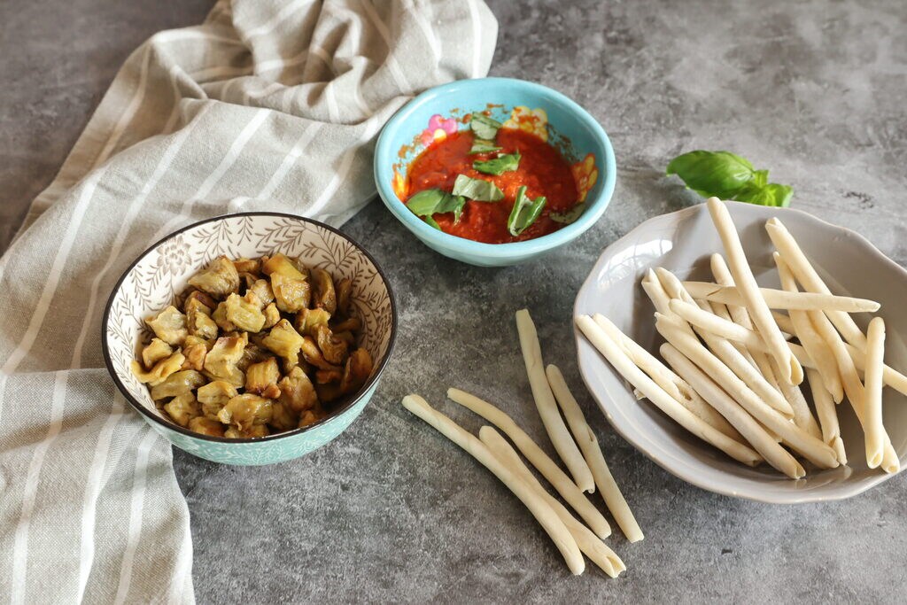 Notwendige Zutaten für die Zubereitung von Maccheroni alla Norma