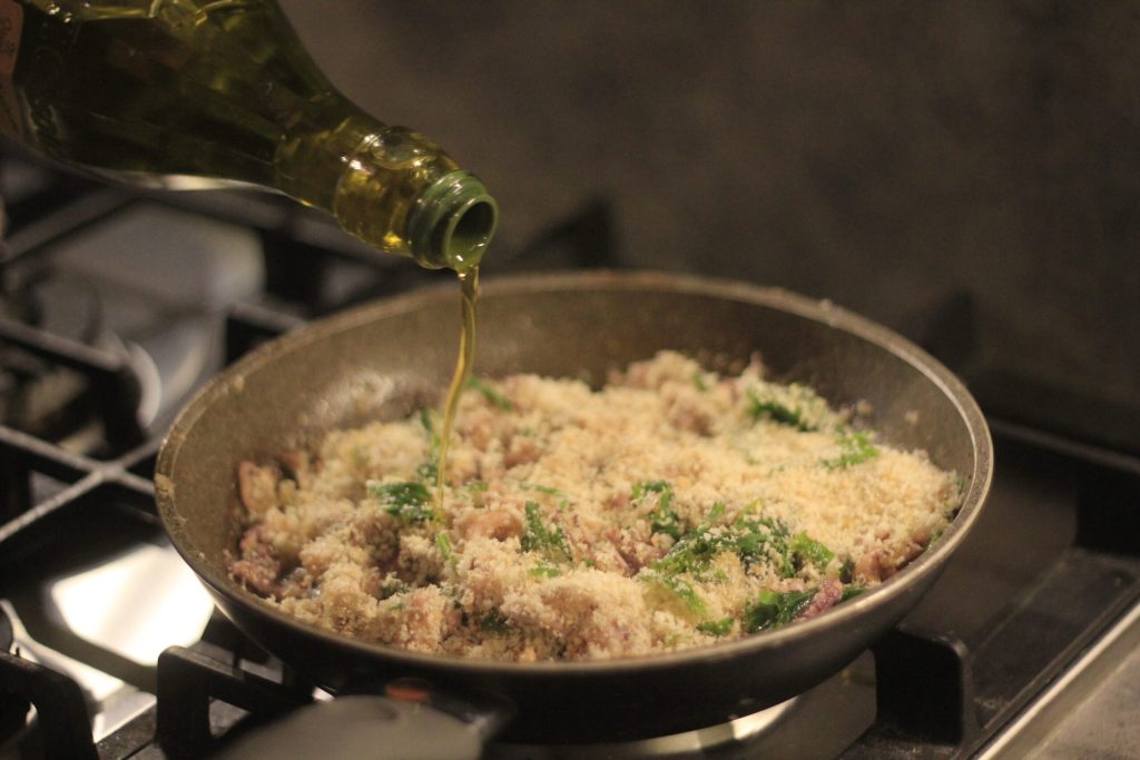• Fügen Sie die Semmelbrösel mit der Petersilie, die Kapern mit dem Olivenöl und schließlich das Ei mit dem Salz hinzu.