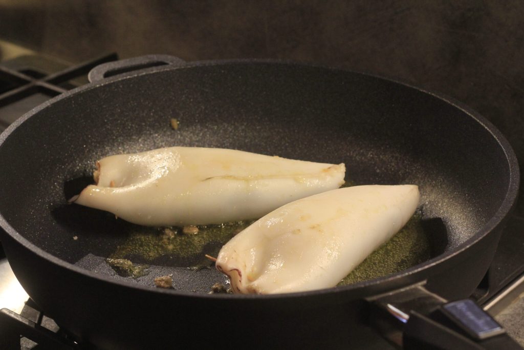 • Legen Sie die gefüllten Kalamari in den Bratentopf auf einen Strang Öl und lassen Sie sie leicht anbraten.