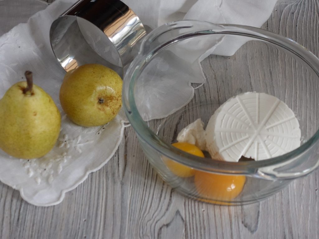 Fügen Sie zur Ricotta die Eigelbe und den Zucker hinzu und schlagen Sie, bis es eine glatte Creme wird. Schälen Sie das Obst, entfernen Sie das Kerngehäuse und den Stiel und hacken Sie es, fügen Sie es der Ricotta hinzu. Schneiden Sie aus dem Blätterteig 12 Scheiben von 8 Zentimetern aus.