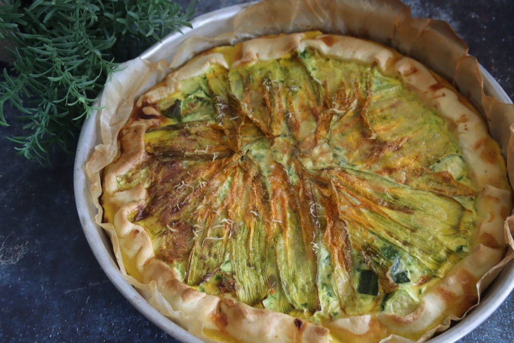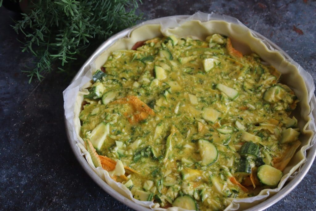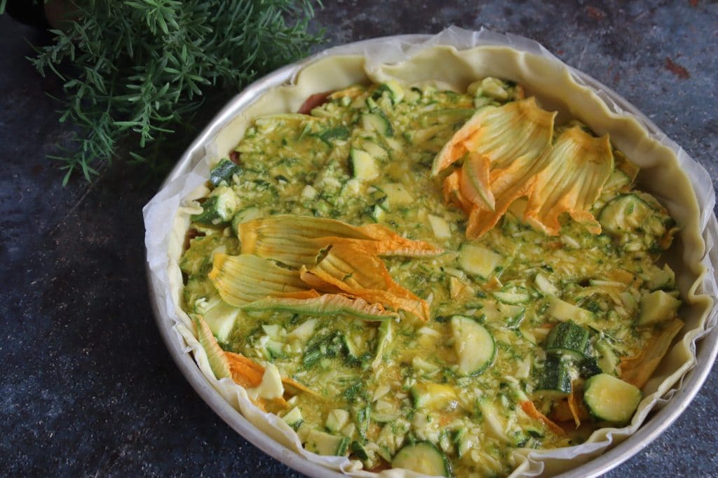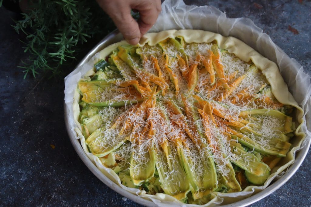 • Bedecken Sie es mit den restlichen Zucchiniblüten.