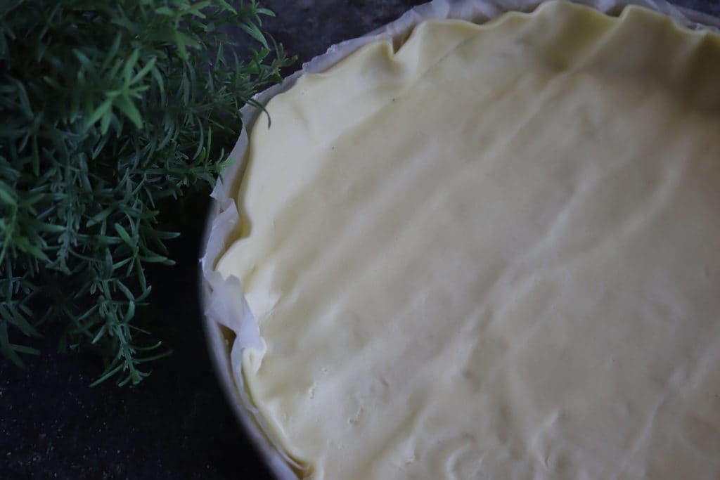 • Ich habe den fertigen, runden Blätterteig verwendet; Ich habe ihn mit seinem eigenen Backpapier in die Form gelegt und die Ränder mit einer Schere zugeschnitten.