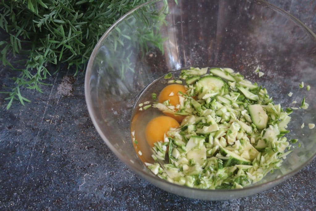 • Ohne die Zucchini zu schälen, schneiden Sie sie mit dem Schnurhäcksler in Stücke und geben Sie sie zusammen mit den Eiern in eine Schüssel.