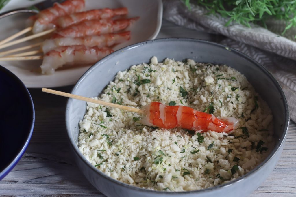 Hier sind die panierten Riesengarnelen am Spieß fertig