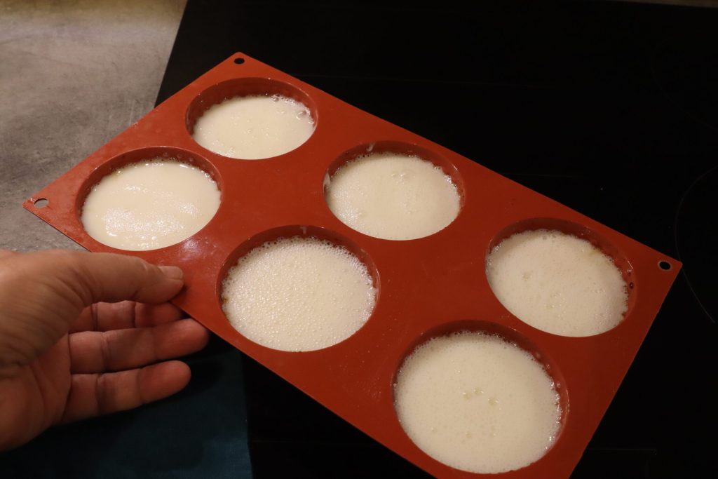 Ich lasse die Panna cotta gut in den Silikonförmchen abkühlen, bevor ich sie zum Abkühlen in den Kühlschrank stelle.