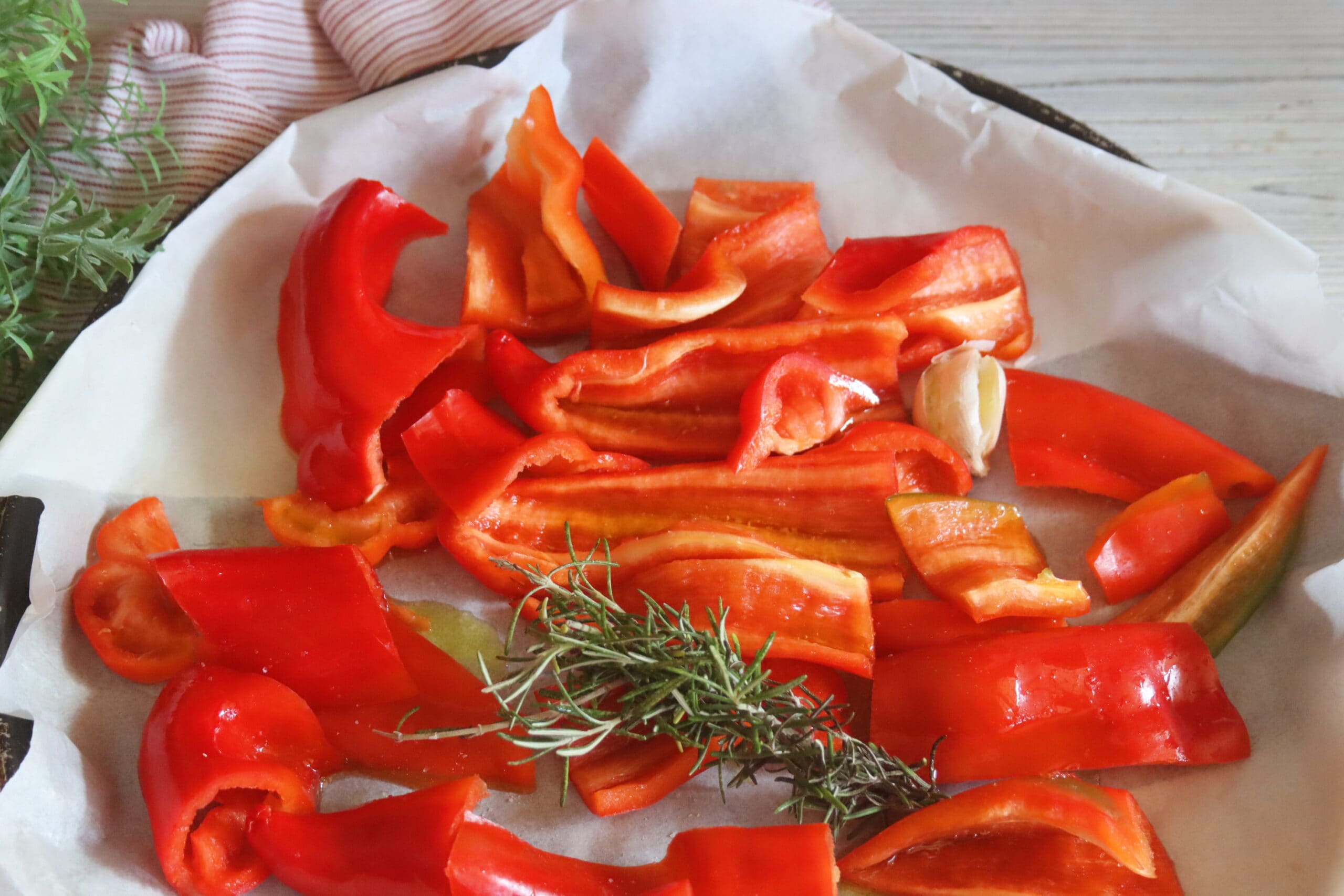 Schneiden Sie die Paprika in Streifen und würzen Sie sie in einem Backblech auf Backpapier mit Salz und EVO-Öl, einem schönen Zweig Rosmarin und einer Knoblauchzehe.