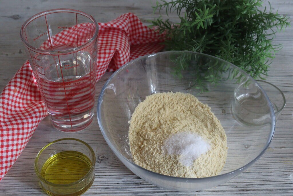• Fügen Sie das Salz zum Kichererbsenmehl hinzu und mischen Sie,