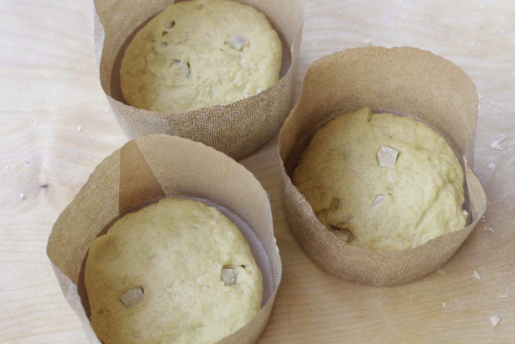 Ich teile den Teig in drei Teile und setze ihn in 3 Pergamentpapier-Behälter à 500 g. Dann lasse ich ihn weitere 1 Stunde ruhen. Alternativ könnt ihr eine einzelne Form für 1 kg verwenden.